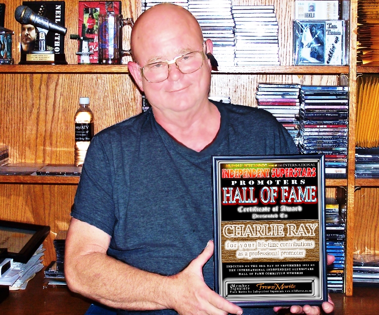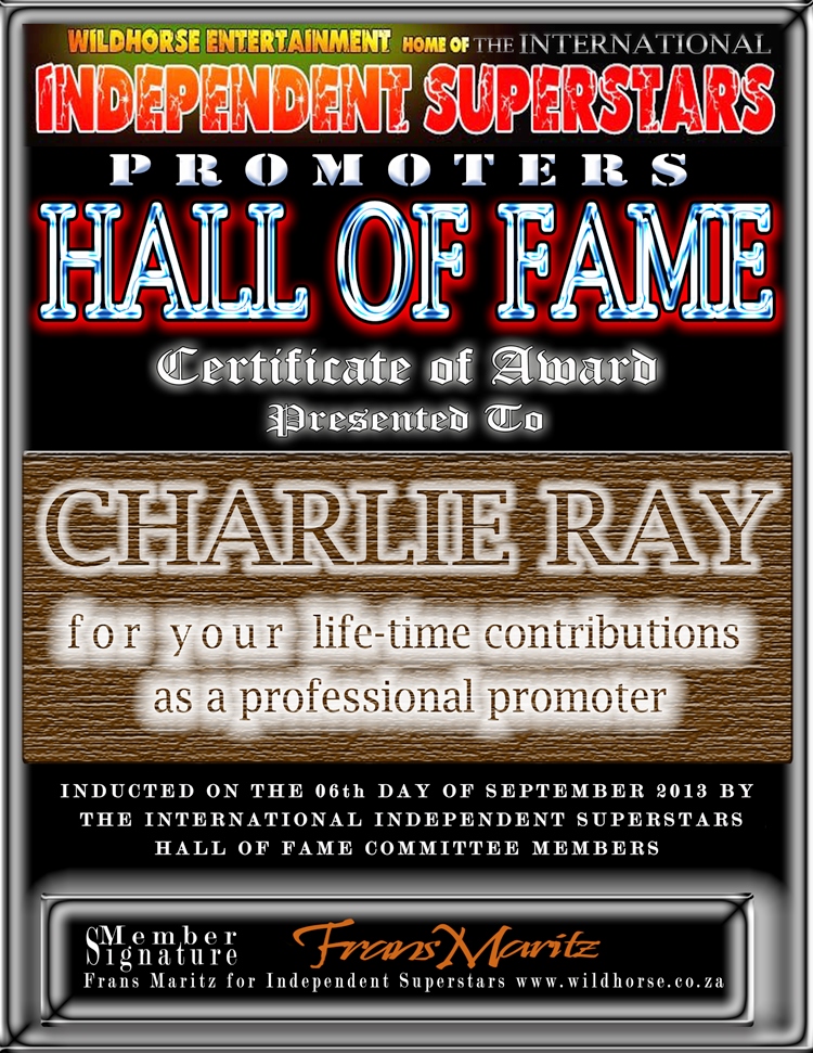 Charlie Ray has been inducted into the Independent Superstars “Promoters” Hall of Fame. Frans Maritz (Wildhorse Entertainment) signed the official certificate placing Charlie into this prestigious organization located in South Africa. Charlie has the distinct honor of being inducted into the IDSS Hall of Fame for his life-time contribution to the Independent Music Industry. Charlie is seen in the picture below with the award confirming his induction into the HALL OF FAME. “This is just so great, thank you so much”, Charlie Ray