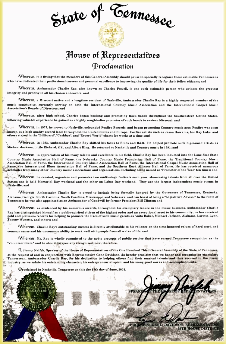 Biography of Charlie Ray as printed on the State Of Tennessee House Of Representatives Proclamation: