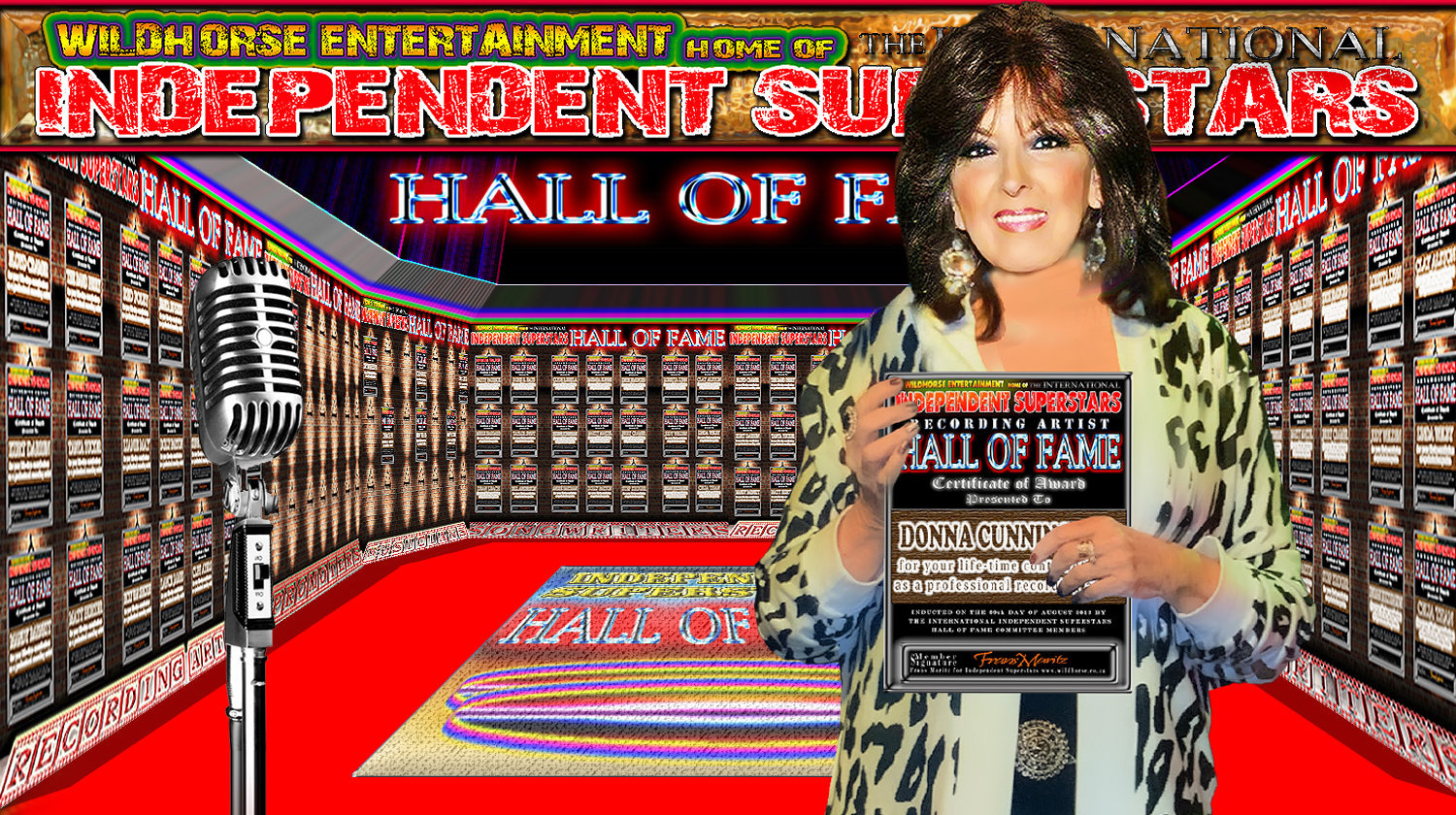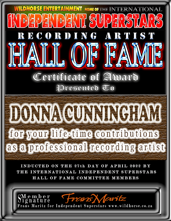 Donna Cunningham has been inducted into the Independent Superstars “Recording Artists” Hall of Fame. Frans Maritz (Wildhorse Entertainment) signed the official certificate placing Donna into this prestigious organization located in South Africa. Donna has the distinct honor of being inducted into the IDSS Hall of Fame for her lifetime contribution to the Independent Music Industry as a Recording Artist. Donna is seen holding her award below in the animated Hall Of Fame, confirming her induction into the Hall Of Fame. “I am honored beyond belief to be included in this Hall of Fame for the Independent music industry. Thanks to all, and thanks to Frans for all his work and support.” – Donna Cunningham