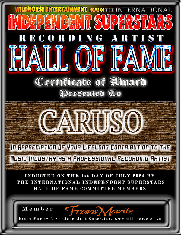 Caruso has been inducted into the Independent Superstars “Recording Artist” Hall of Fame. Frans Maritz (Wildhorse Entertainment, AirplayExpress) signed the official certificate placing Caruso into this prestigious organization located in South Africa. Caruso has the distinct honor of being inducted into the IDSS Hall of Fame for his life-time contribution to the Independent Music Industry as a Recording Artist. Caruso is seen holding his award below in the animated Hall Of Fame, confirming his induction into the Hall Of Fame. “I am honored and humbled to accept my induction on July 1st into the Independent Superstars Recording Artists Hall Of Fame, I thank God, Amanda May, My Family, Fans and esteemed colleagues that voted me in.” Caruso