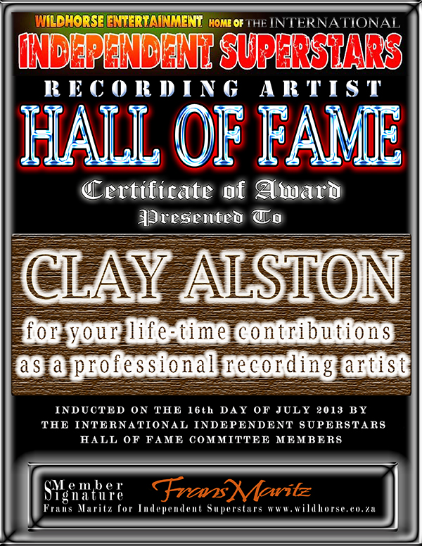 Country Recording Artist Clay Alston has been Inducted into Independent Superstars Hall Of fame: Frans Maritz of Wildhorse Entertainment, located in South Africa, signed the official certificate placing Clay Alston into this prestigious organization. Clay Alston has the distinct honor of being inducted into the IDSS Hall of Fame for his life-time contribution to the Music Industry, which he truly has been a huge part of for many years. Clay Alston is seen in the picture below with the award confirming his induction into the Hall Of Fame. Clay Alston expressed his thanks on being inducted into the IDSS Hall Of Fame: “Thank Y’all so much Y’all have really helped me get my name out and I can’t thank you enough.” Clay Alston