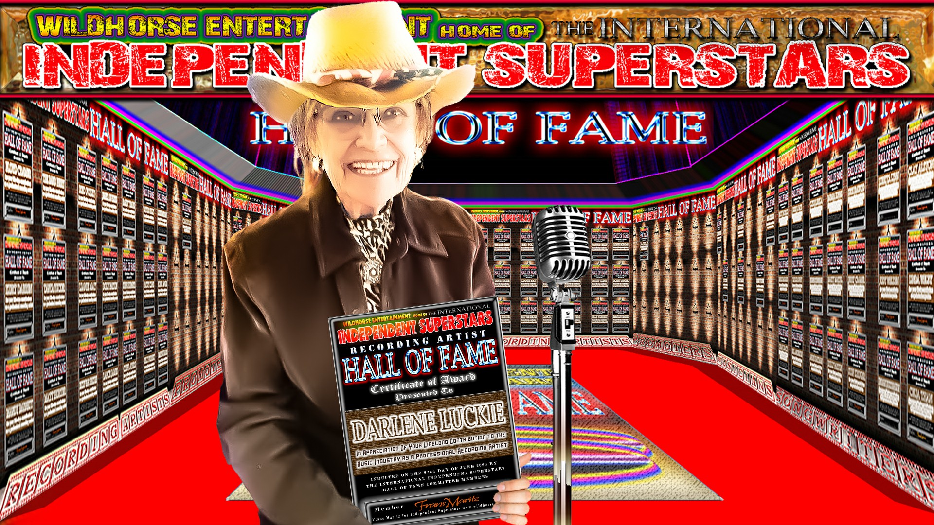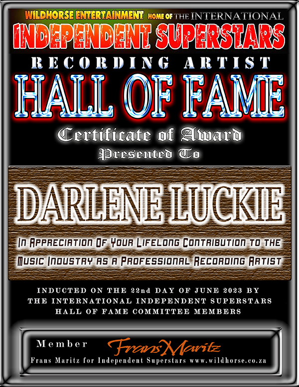 Darlene Luckie has been inducted into the Independent Superstars “Recording Artists” Hall of Fame. Frans Maritz (Wildhorse Entertainment) signed the official certificate placing Darlene into this prestigious organization located in South Africa. Darlene has the distinct honor of being inducted into the IDSS Hall of Fame for her lifetime contribution to the Independent Music Industry as a Recording Artist. Darlene is seen holding her award below in the animated Hall Of Fame, confirming her induction into the Hall Of Fame. “This is truly an unbelievable and unexpected honor!!!!!!! I thank God Almighty with all my heart. I owe him everything. I am eternally grateful!!! Doors were opened I didn’t even know existed. God must really love me I am so humbled..” – Darlene Luckie