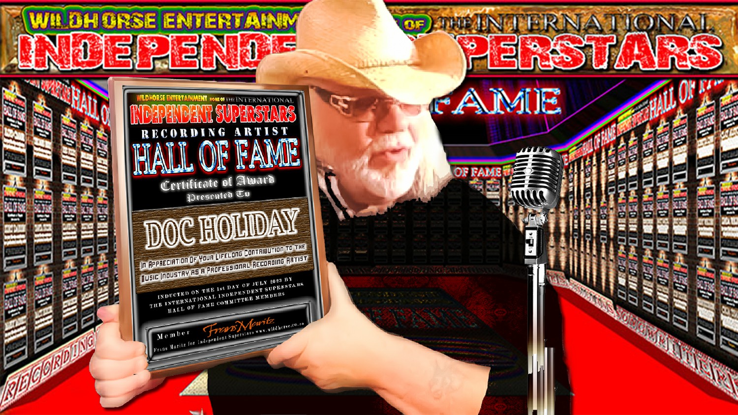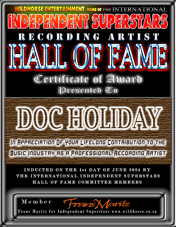Doc Holiday has been inducted into the Independent Superstars ‘Recording Artist’ Hall of Fame. Frans Maritz (Wildhorse Entertainment) signed the official certificate placing Doc into this prestigious organization located in South Africa. Doc Holiday has the distinct honor of being inducted into the IDSS Hall of Fame for his life-time contribution to the Independent Music Industry as a ‘Recording Artist’. Doc is seen holding his award below in the animated Hall Of Fame, confirming his induction into the Hall Of Fame. “Being a recording artist and having the opportunity to do what I love best is such a blessing. I am honored to have worked with some of the best musicians on the west coast, east coast, and overseas. It’s all great! I greatly enjoy the creative process of recording music. A big thank you goes out to Frans Maritz and all those who support me and my music! I want to add that it is a joy knowing that music is part of my life, no matter where I am or what I’m doing thank you.” Doc Holiday