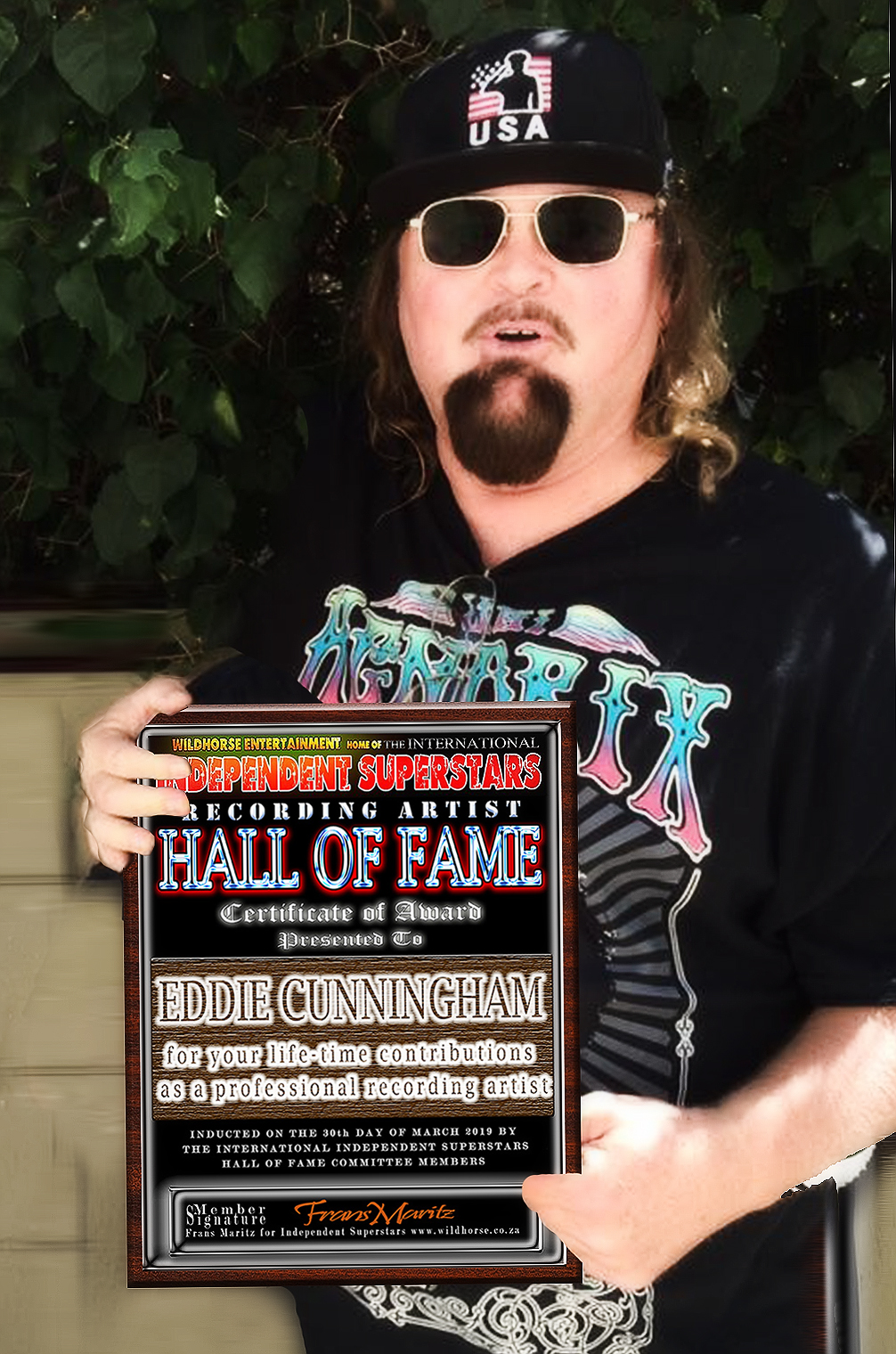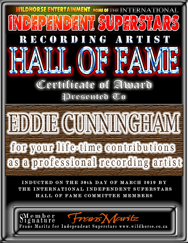 Eddie Cunningham has been inducted into the Independent Superstars “Recording Artists” Hall of Fame. Frans Maritz (Wildhorse Entertainment) signed the official certificate placing Eddie into this prestigious organization located in South Africa. Eddie has the distinct honor of being inducted into the IDSS Hall of Fame for his life-time contribution to the Independent Music Industry as a Recording Artist. Eddie is seen holding his award below in the animated Hall Of Fame, confirming his induction into the HALL OF FAME. “ Thank you Frans being in the Hall Of Fame is just so great! I’m honored” Eddie Cunningham