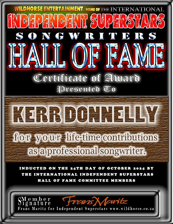 Kerr Donnelly has been inducted into the Independent Superstars “Songwriting” Hall of Fame. Frans Maritz (Wildhorse Entertainment) signed the official certificate placing  Kerr into this prestigious organization located in South Africa. Kerr Donnelly has the distinct honor of being inducted into the IDSS Hall of Fame for his life-time contribution to the Independent Music Industry as a Songwriter. Kerr is seen holding his award below in the animated Hall Of Fame, confirming his induction into the Hall Of Fame. “Absolutely wonderful News I’m really honoured to be included to the Songwriters HALL OF FAME. I Accepted the Award for not only myself but for my brothers in the band Andy, Marty and Lee. A Massive thank you goes to Frans Maritz and all the Committee members for inducting me. I’m really blessed and grateful.” Kerr Donnellyhoflogo
