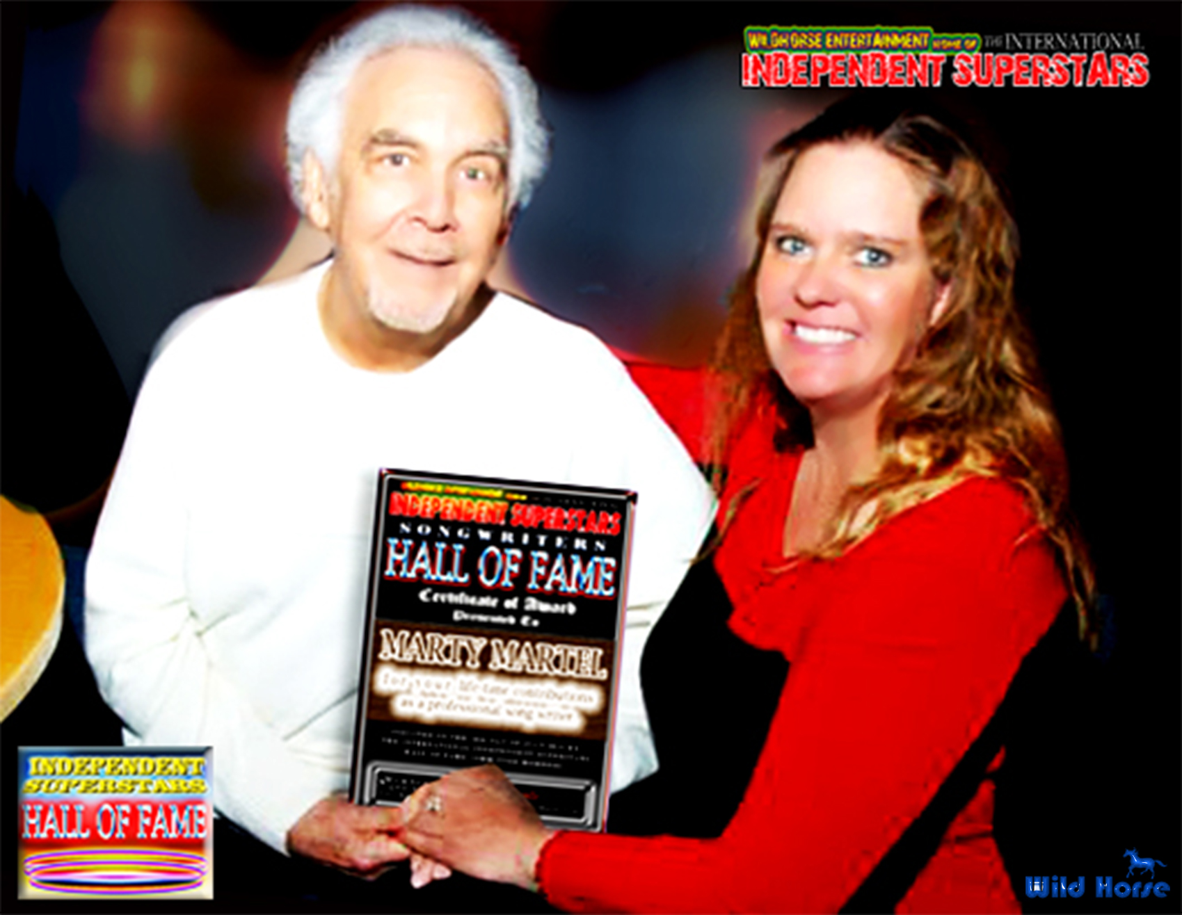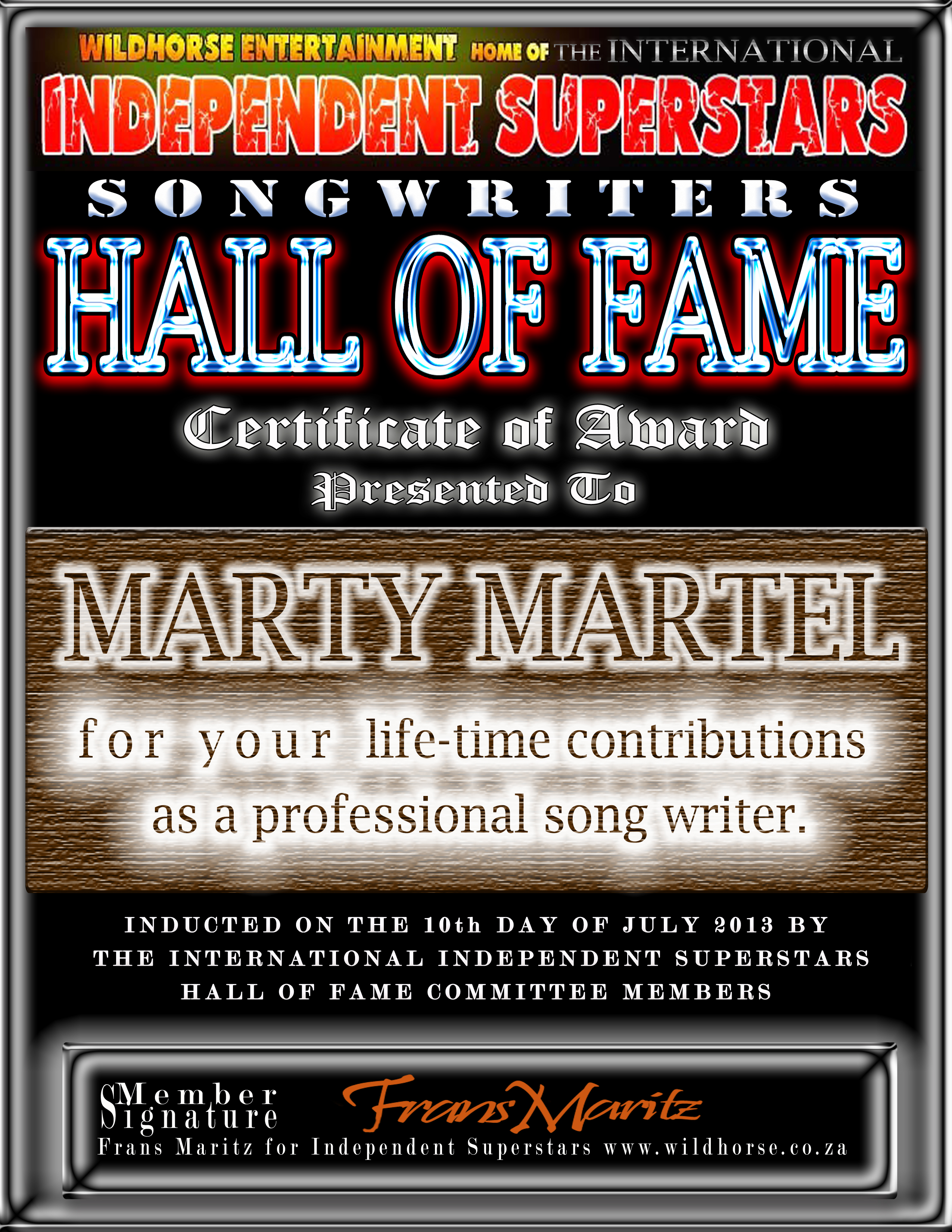 Marty Martel has been inducted into the Independent Superstars “Songwriters” Hall of Fame. Frans Maritz (Wildhorse Entertainment) signed the official certificate placing Marty into this prestigious organization located in South Africa. Marty has the distinct honor of being inducted into the IDSS Hall of Fame for his life-time contribution to the Independent Music Industry. Marty is seen receiving his award in the picture below from Julie Richardson, during a recent function in Nashville, confirming his induction into the HALL OF FAME. “Just read an email from Keith Bradford and I was knocked out of my chair. Never expected anything like this beautiful recognition award. From the bottom of my heart, I thank you so much for making this day of my life one of complete happiness. God Bless you My Friend. It is awesomely beautiful, and I know I do not deserve it, but I will take it.” Marty Martel