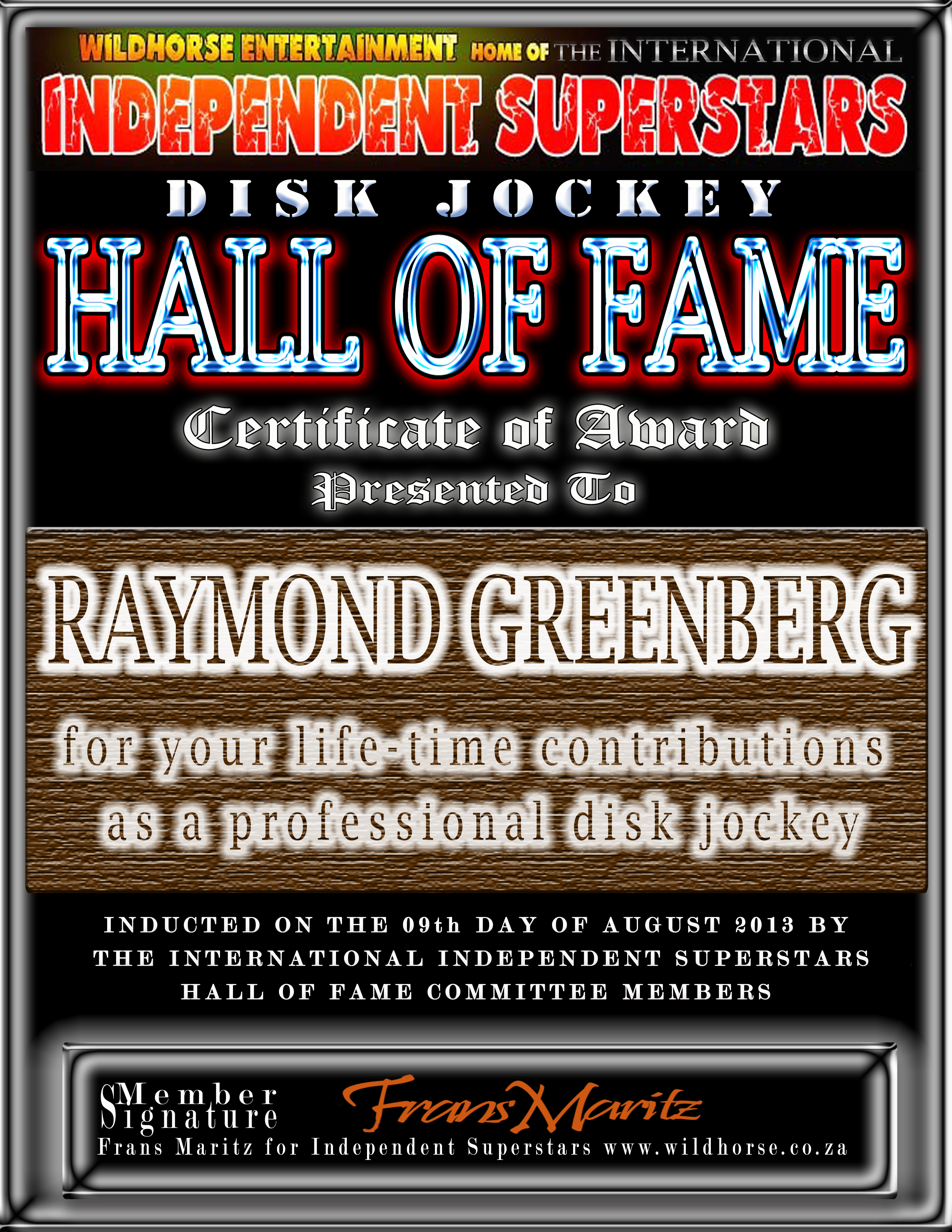 Raymond Greenberg has been inducted into the Independent Superstars “Disc Jockey” Hall of Fame. Frans Maritz (Wildhorse Entertainment) signed the official certificate placing Raymond into this prestigious organization located in South Africa. Raymond has the distinct honor of being inducted into the IDSS Hall of Fame for his life-time contribution to the Independent Music Industry as a Disk Jockey.