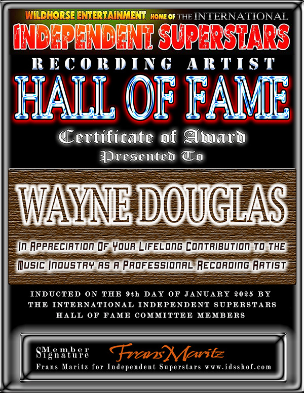 Wayne Douglas has been inducted into Independent Superstars’ “Recording Artist Hall of Fame”. In recognition of Wayne‘s achievement, Wildhorse Entertainment’s Frans Maritz placed him in this prestigious organization with the approval of the International HOF committee members. His life-time contribution to the Independent Music Industry as a Recording Artist has earned him his induction into the IDSS Hall of Fame. As Wayne Douglas holds his award during his induction into the HALL OF FAME, he demonstrates his pride in being inducted. “After 45 years of doing music, I am far from being an overnight sensation. But it is a great feeling to be recognized for my art and being inducted into the Independent Supertsars Recording Artists Hall Of Fame. Thank you for this great honor.”  Wayne Douglashoflogo